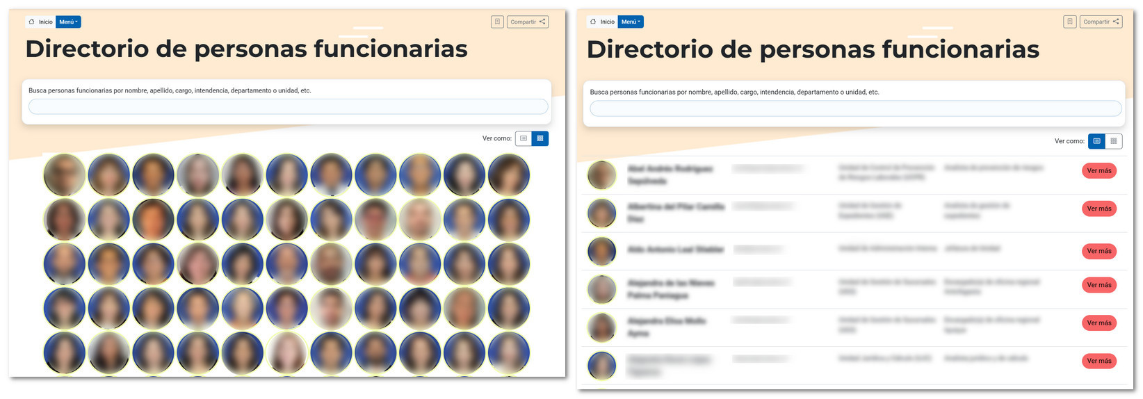 Buscador de funcionarios: se puede escribir el nombre, apellido, cargo, departamento o unidad laboral. La vista de fotos se puede cambiar a una lista con más información.